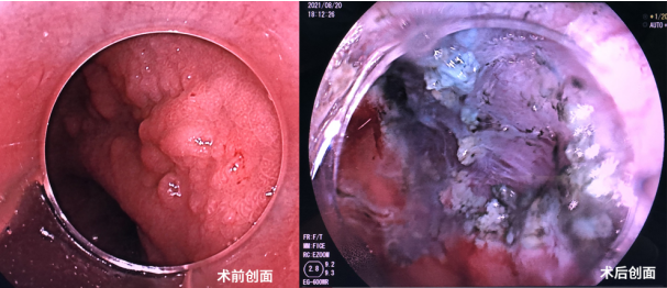 手术中,医护人员经历了重重困难。术中发现肿瘤位于胃镜难以调整、无法查探的位置,医护人员开动脑筋,大胆创新,临时决定用结肠镜代替胃镜,最终精确地找到肿瘤位置。由于肿瘤面积较大,为确保患者生命安全,医护人员耐心细致的使用橡皮圈套器分批分块将病灶粘膜逐一切除,并使用多个止血夹处理创面,历时两个半小时,成功将病灶顺利切除。经过术后严密监护,对症治疗和日常精心护理,患者恢复情况良好,现已康复出院。