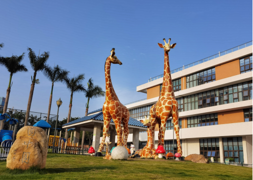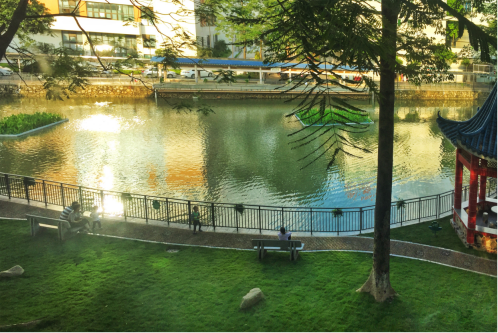 调研组一路参观了长颈鹿广场、悬壶济世雕塑群、休闲草坪、运动场、水帘瀑布、未名湖等地。