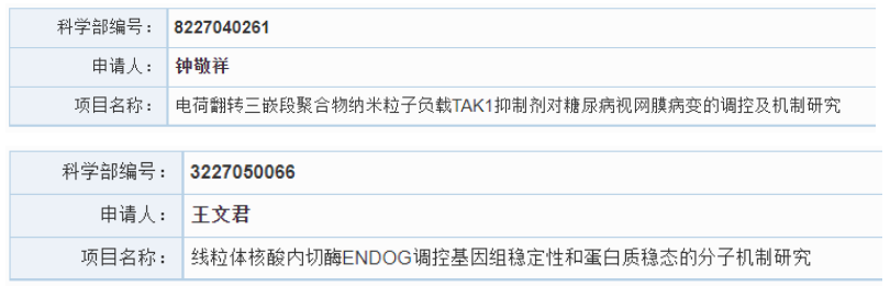 近日,国家自然科学基金委员会公布了2022年度国家自然科学基金资助项目,市东部中心医院(暨南大学附属第六医院)院长钟敬祥申报的《电荷翻转三嵌段聚合物纳米粒子负载TAK1抑制剂对糖尿病视网膜病变的调控及机制研究》和王文君博士申报的《线粒体核酸内切酶ENDOG调控基因组稳定性和蛋白质稳态的分子机制研究》两个项目获国家自然基金面上项目立项。