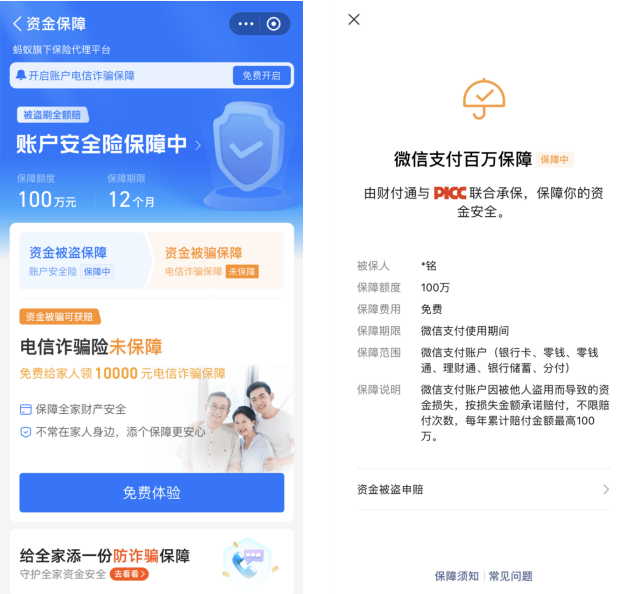 支付宝账户安全险,是用户自行投保的商业保险,保期一年,到期后可再次续保。微信支付“百万保障”,不会“到期”或者“过期”,不会要求“缴费续保”。