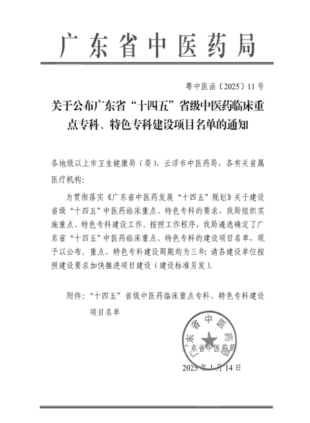 近日,广东省中医药局公布了广东省“十四五”省级中医药临床重点专科、特色专科建设项目名单,东莞市中医院(广州中医药大学东莞医院)肿瘤科、肾病科、急诊科3个专科成功获批广东省“十四五”省级中医药临床重点专科建设项目!