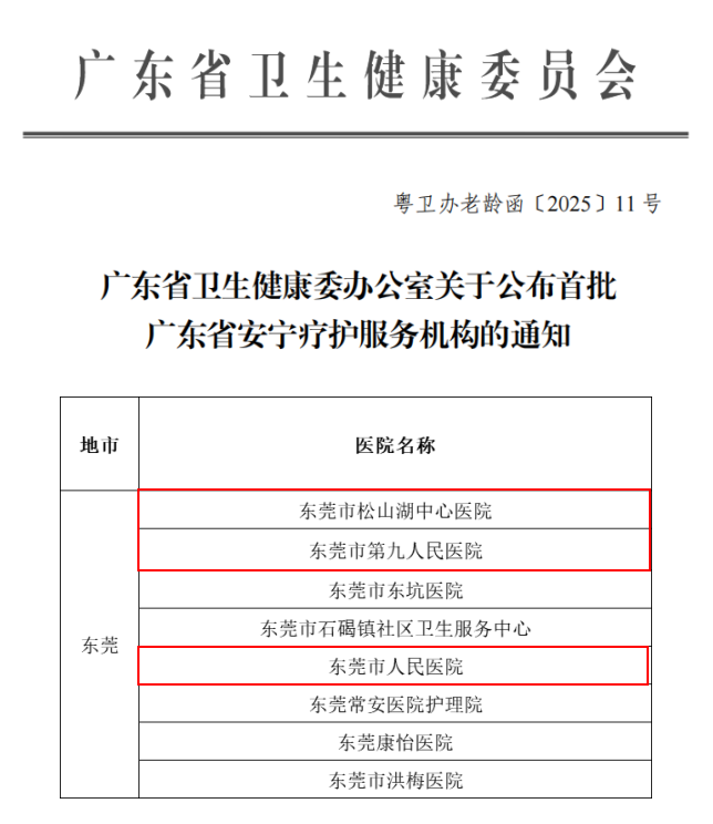 近日,广东省卫生健康委正式公布首批安宁疗护服务机构名单,全省共214家机构入选,全省21地市全覆盖。其中,东莞市人民医院、东莞市松山湖中心医院、东莞市第九人民医院等3家市属公立医院成功入围,成为东莞8家获此资质机构的重要组成部分。