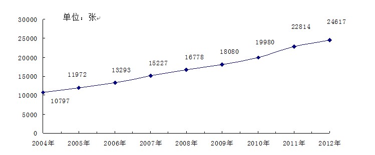 全市医院的床位逐年增长,由2004年--2012年医院实有床位数变化趋势图可见(如图1),床位年均增长率为12.5%。