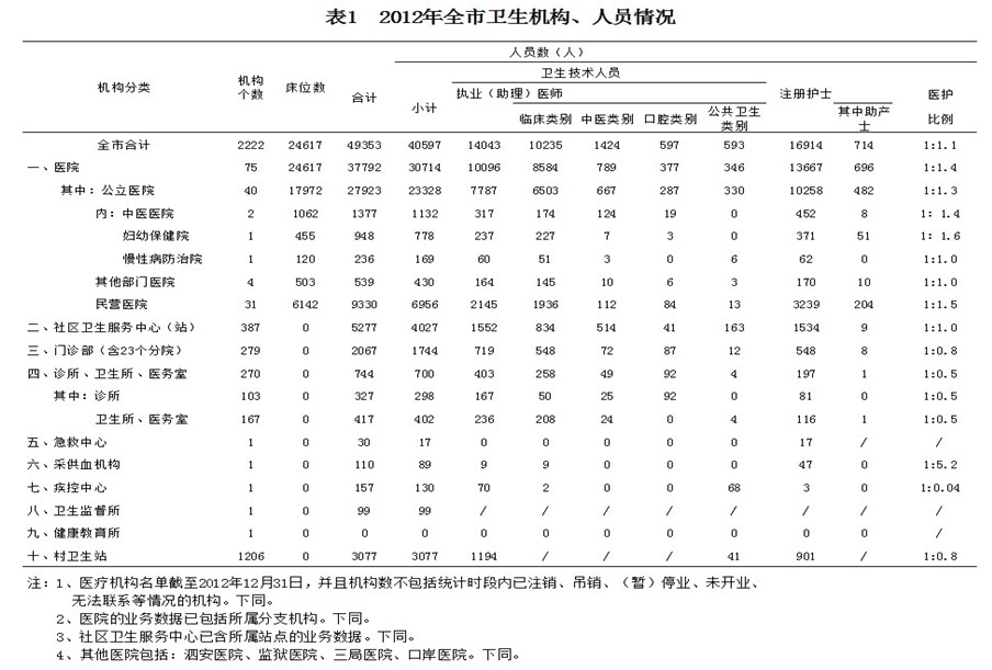 2012年全市医疗卫生机构数2222所,机构数较去年略有减少,其中,医院75所(同比增加1所民营妇科医院,简称同比,下同),分院23所,社区卫生服务机构387所(同比减少3所),门诊部256所(同比增加14所),诊所103所(同比增加8所),卫生所医务室167所(同比减少10所),村卫生站1206所(同比减少37所),5所其他卫生机构(疾控、卫监、120、血站、健康教育所)。(备注:机构数截止2012年12月,未统计已注销,吊销、(暂)停业、未开业、无法联系的机构。)