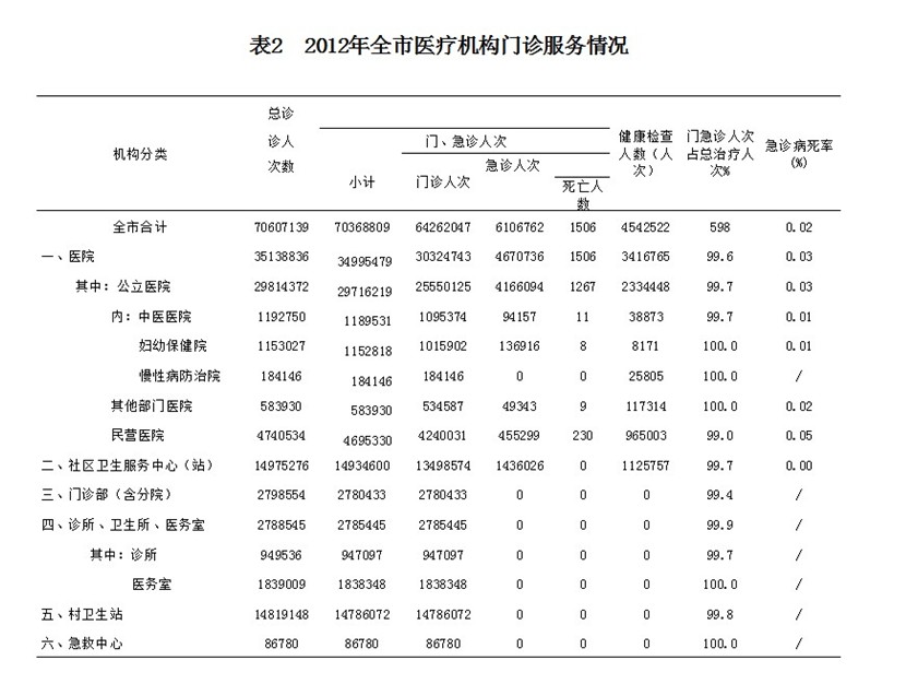 2012年全市医疗机构的门诊总量为7061万人次,其中医院3514万人次(同比上升3.4%),社区卫生服务机构1498万人次(同比上升4.5%)。基层医疗机构门急诊量为5940万人次,占全市医疗机构门急诊量的比例为84.6%。