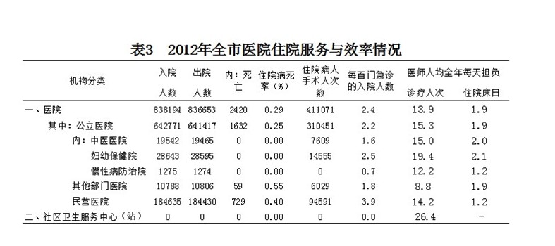 2012年全市出院人数为83.6万人次,同比上升8.4%。公立医院和民营医院的出院人数分别为64.1万人次和18.4万人次,同比上升7.9%和8.9%。其他部门医院的出院人数为1.1万人次,同比上升22.2%。