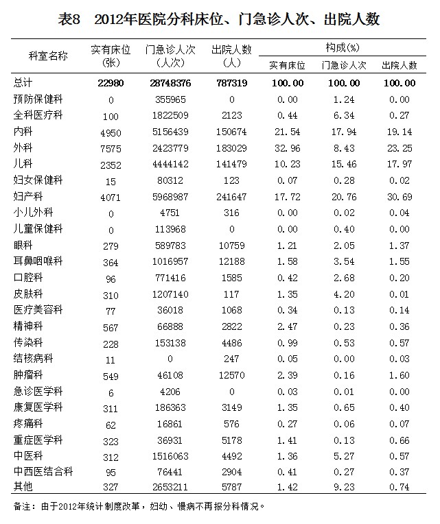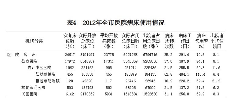 2012全市实有床位24617张,同比上升7.9%,其中:公立医院17972张(同比增8.5%),民营医院6142张(同比增6.8%)。800张以上的医院共8所(7所综合医院,1所中医院),其中民营医院占了2所。